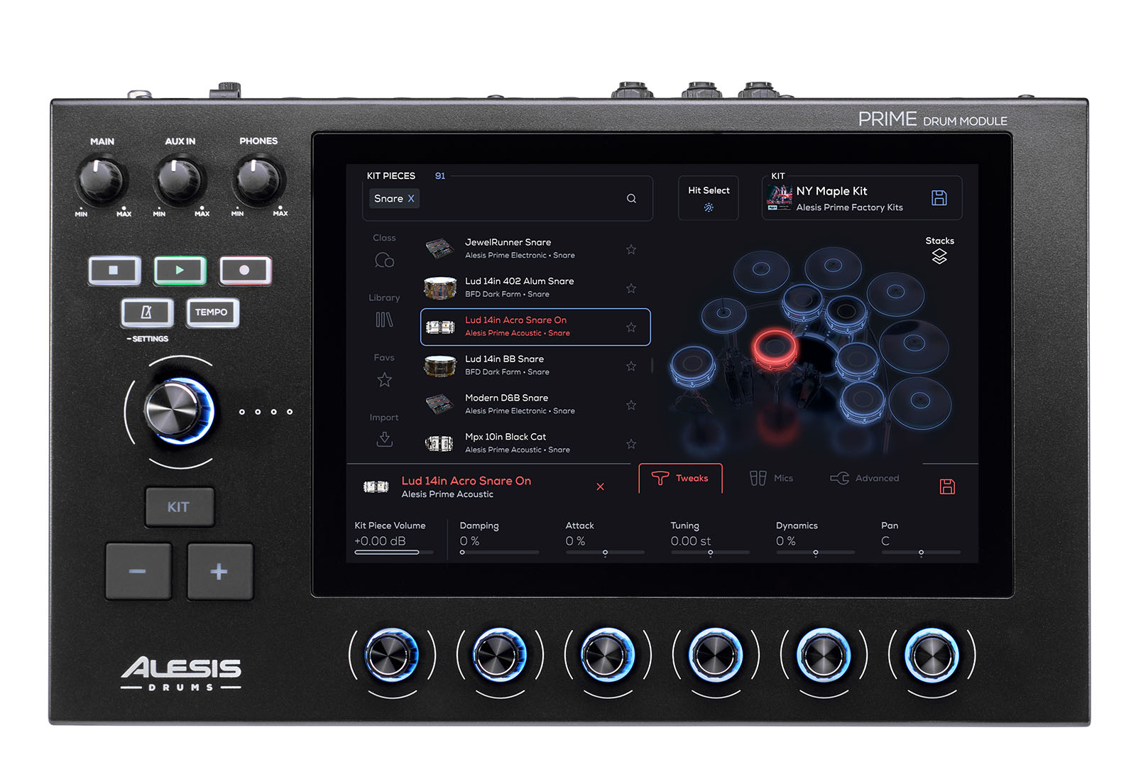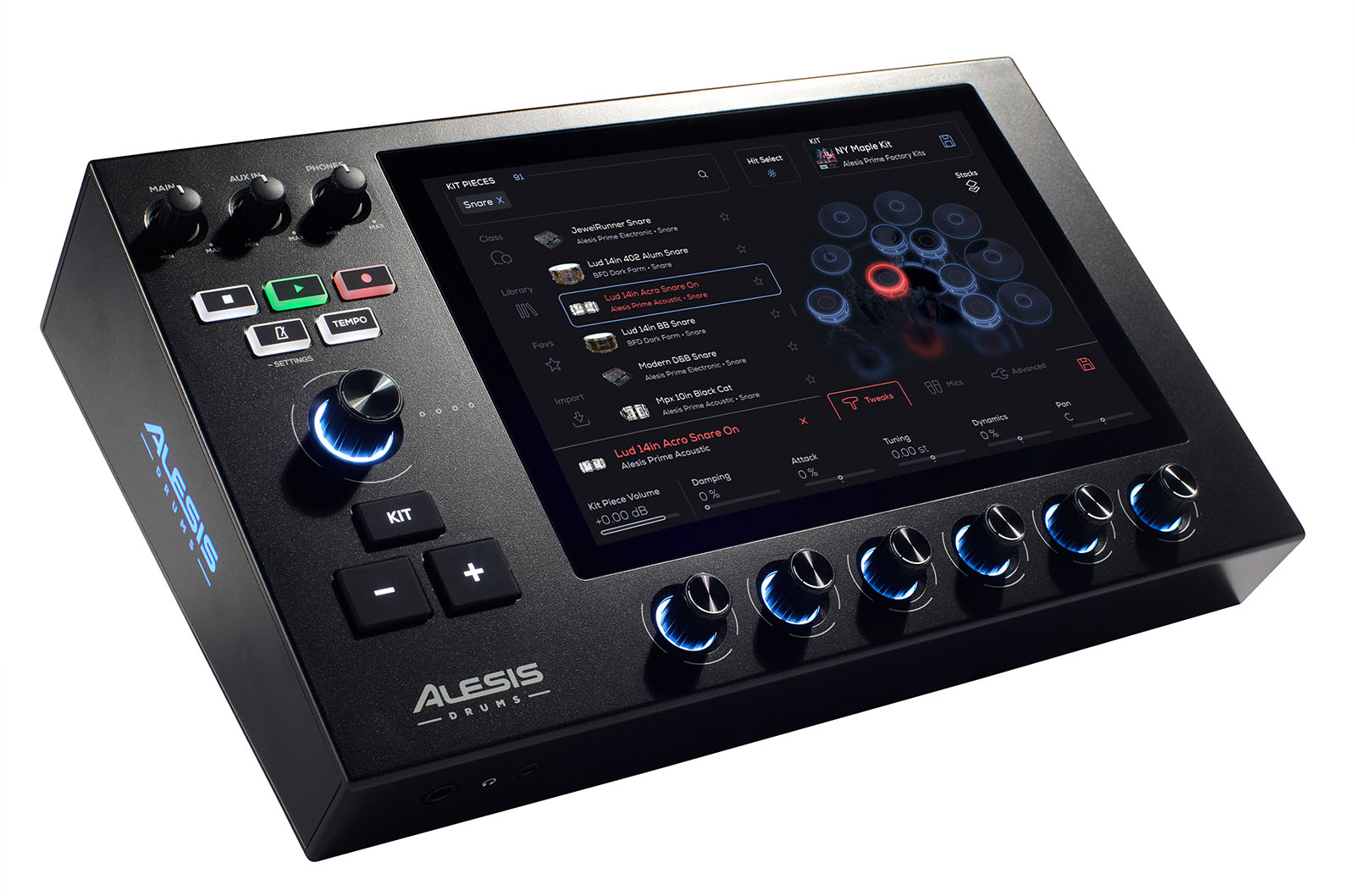 Grâce à l'écran tactile intuitif, la configuration de votre kit est rapide et aisée. Vous pouvez ajuster chaque tom, chaque son et les effets en toute simplicité. Il y a également six encodeurs rotatifs pour un défilement rapide grâce à l’écran tactile, ainsi qu’un encodeur principal pour les boutons de volume dédiés aux sorties principales, smartphones et auxiliaires.