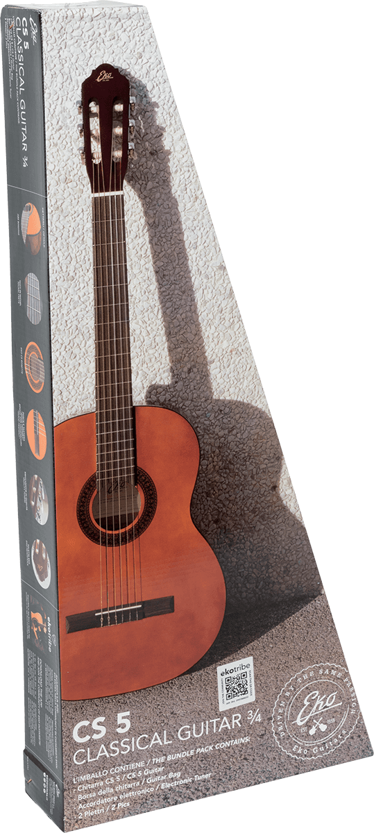 CS Packs - 3/4 Pack NaturalLa CS-5 est une guitare classique au format 3/4 développée par la marque italienne Eko, spécifiquement pensée pour les jeunes guitaristes à la recherche d'une guitare d'étude accessible et de qualité. Son format compact, avec un diapason de 580 mm, est idéal pour les enfants et les jeunes adolescents, entre 9 et 12 ans.