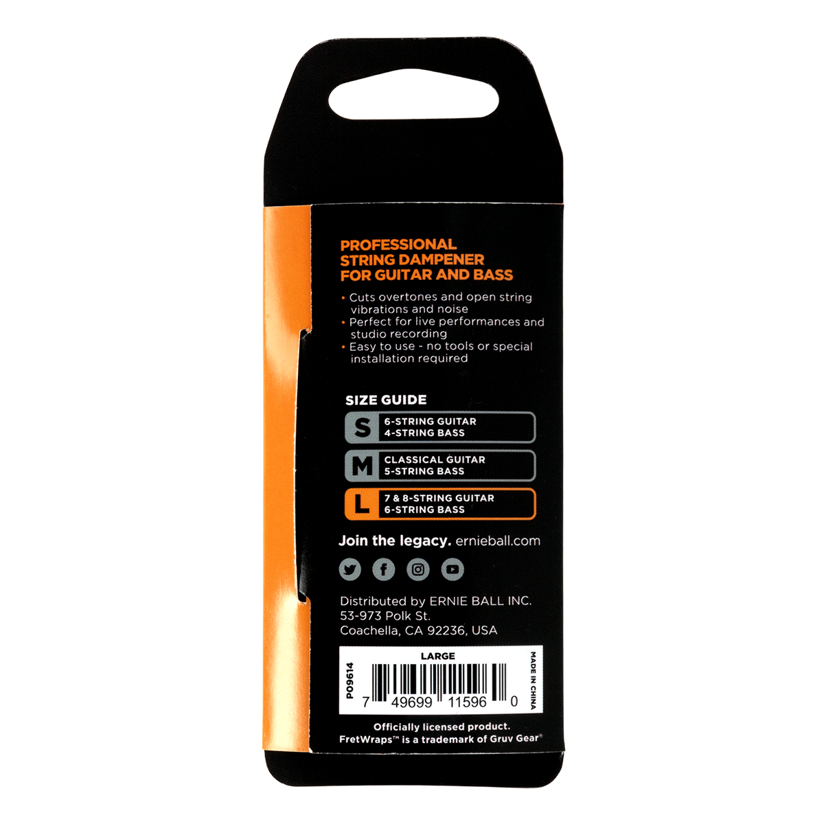Le Ernie Ball "FretWrap by Gruv Gear" est un accessoire professionnel d'atténuation des cordes que chaque studio, musicien de session et aficionado du tapping devrait posséder ! Faites glisser le "FretWrap" pour couper efficacement les harmoniques et la résonance sympathique pendant l'enregistrement, les performances live, le tapping ou toute autre situation créative où vous avez besoin de prises nettes sans le bruit ou le tintement indésirable des cordes. La sangle réglable vous permet de bien ajuster la pression et l'amortissement des cordes. Vous pouvez rapidement glisser l'étouffoir sur la tête du manche lorsqu'il n'est pas utilisé. Aucune modification de la guitare, aucune installation ou aucun outil ne sont nécessaires.- Catégorie : autres