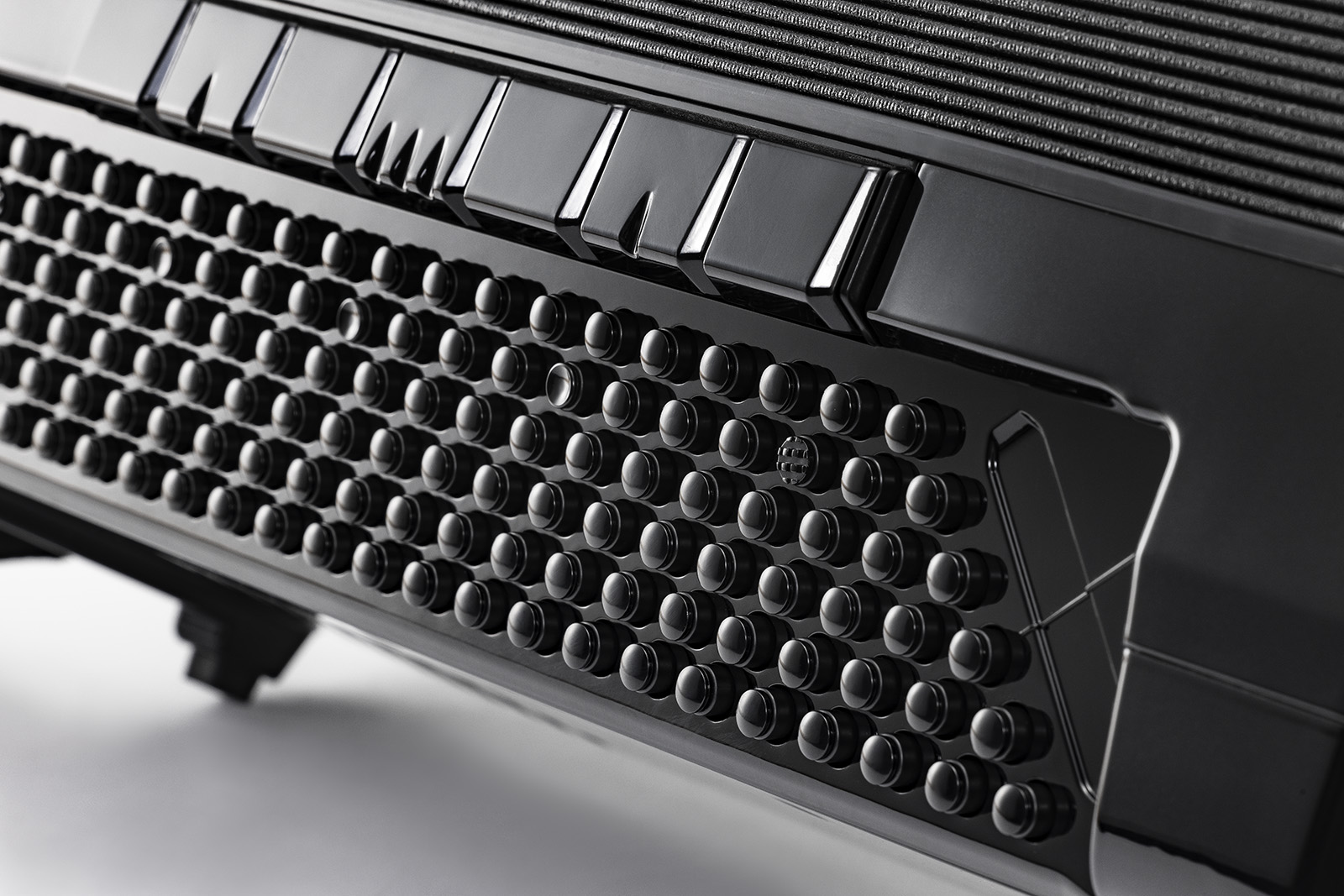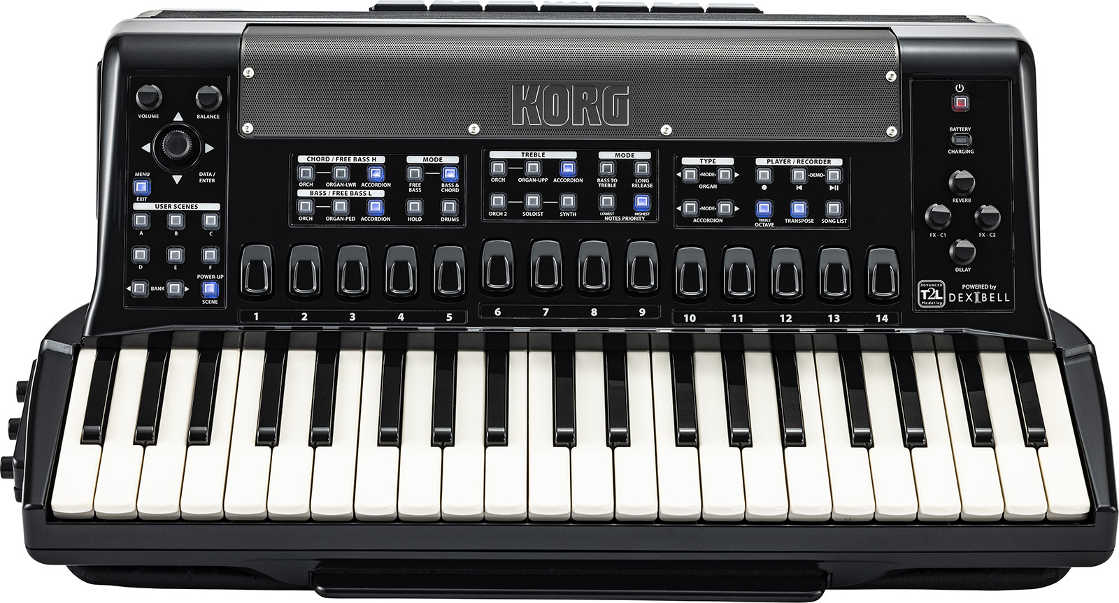 - Registres : 14 pour les aigus, 7 pour les basses/accords, 7 pour les basses libres