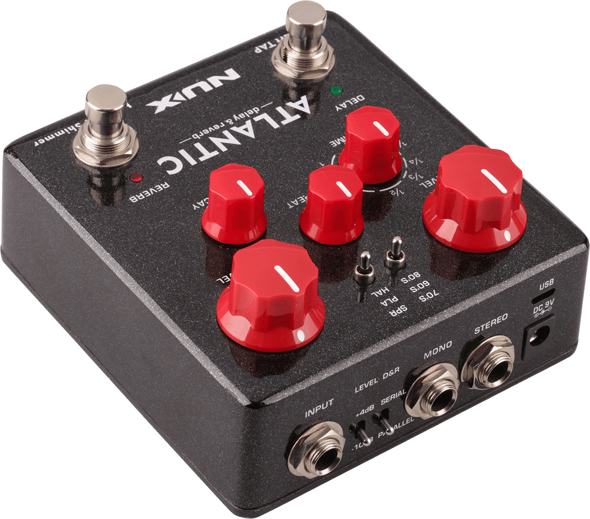 La pédale Nux Atlantic couvre plusieurs types de délai et reverb très représentatifs de l'histoire de la musique. La technologie numérique de modélisation Core Image permet un rendu de qualité studio grâce à des algorithmes savamment étudiés et travaillés.