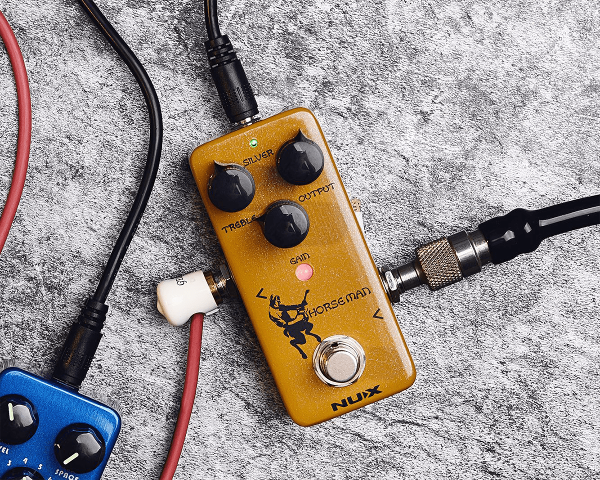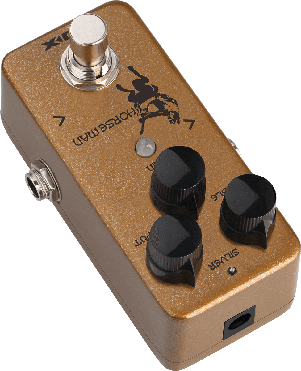 Un concentré de fonctionnalités !En plus de proposer ces sonorités si recherchées, le Nux Horseman concentre plusieurs fonctionnalités pratiques et musicales pour offrir le maximum dans son format mini pédale. Premièrement, il propose 2 modes (Gold et Silver) reprenant les sons et les plages de gain des version dorée ou argentée, pour deux caractères différents d’overdrive (le changement de mode est accessible en appuyant plus d’1,5 seconde sur le footswitch). Aussi, un convertisseur interne de voltage permet de transformer le signal de 9V à 18V afin de produire une meilleure dynamique dans le jeu et surtout plus de headroom, se rapprochant encore mieux d’un rendu sonore plus harmoniques d’un ampli à lampes. Enfin, le Horseman propose l’option de traiter votre signal avec un True Bypass pour garder le signal intact, ou bien d’activer un Buffer pour un meilleur traitement du son si vous multiplier les pédales d’effet, afin d’éviter les pertes de signal. Pour choisir, il suffit de maintenir le footswitch tout en mettant la pédale sous tension et la couleur de la Led indique quel mode est choisi (rouge pour true bypass / vert pour buffer bypass). Avec toutes ses fonctionnalités le Horseman est vraiment une grande pédale d’overdrive / boost dans un format très concentré !