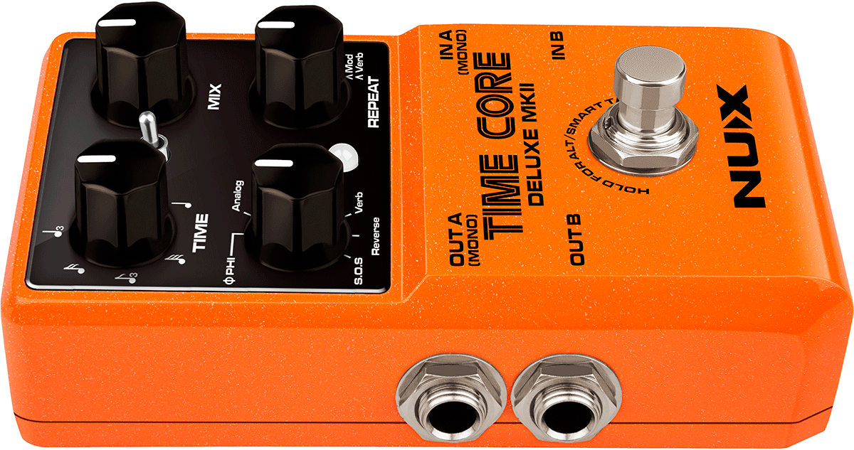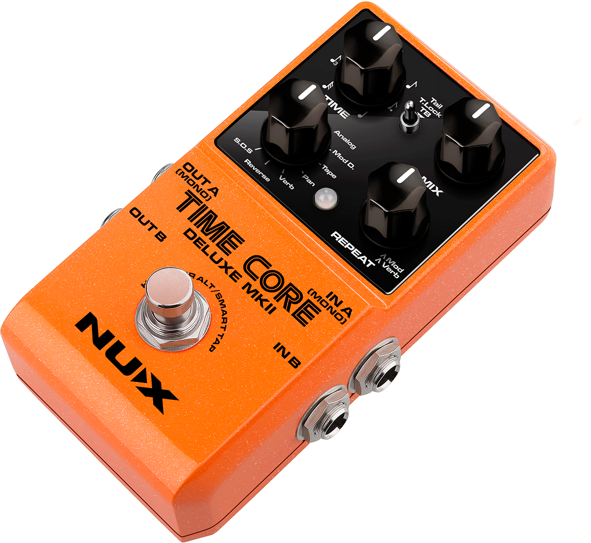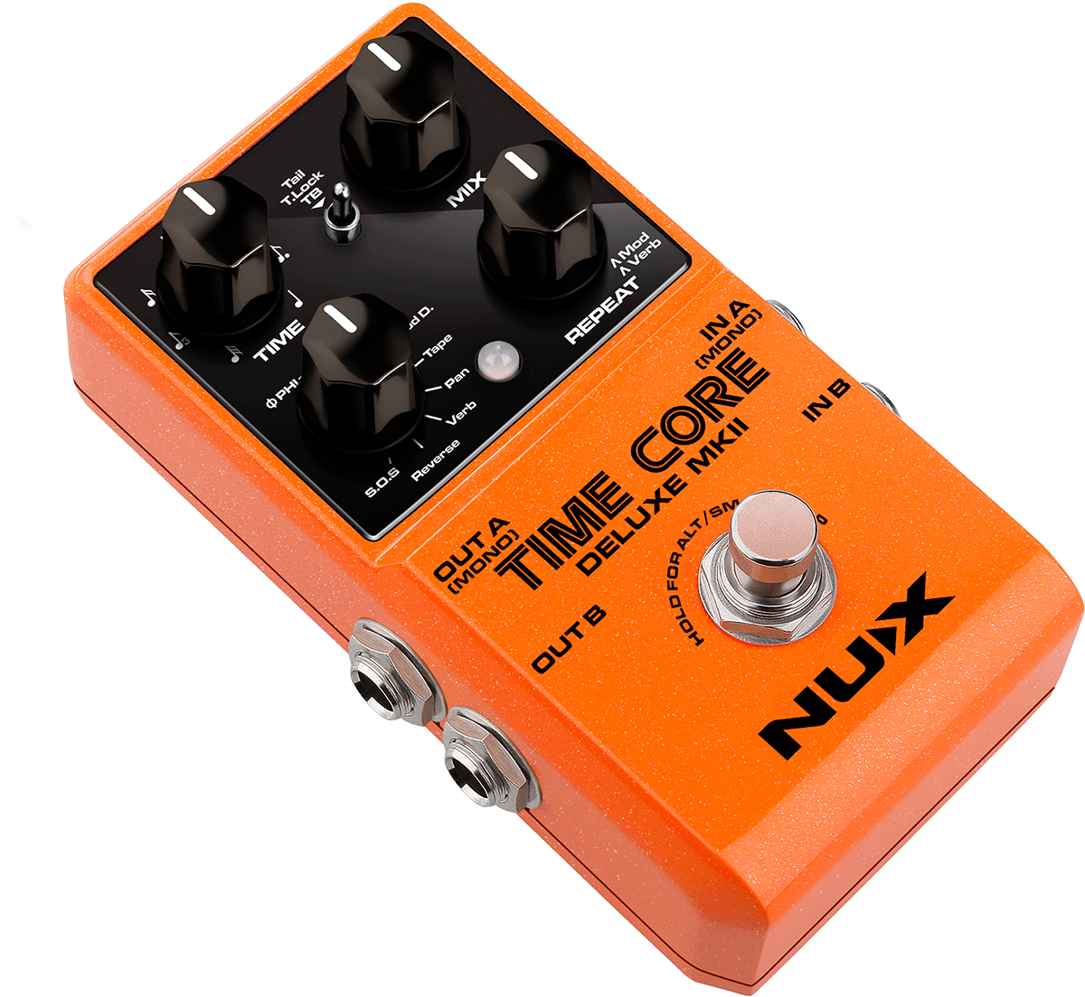 La NUX TIME CORE DELUXE MKII est une pédale d'effet délai avec 7 types de délai différents et un looper de phrase : Φ Phi Digital Delay, Analog Delay, Modulation Delay, Tape Echo, Pan Delay, Verb Delay, Reverse Delay et Sound On Sound (S.O.S).