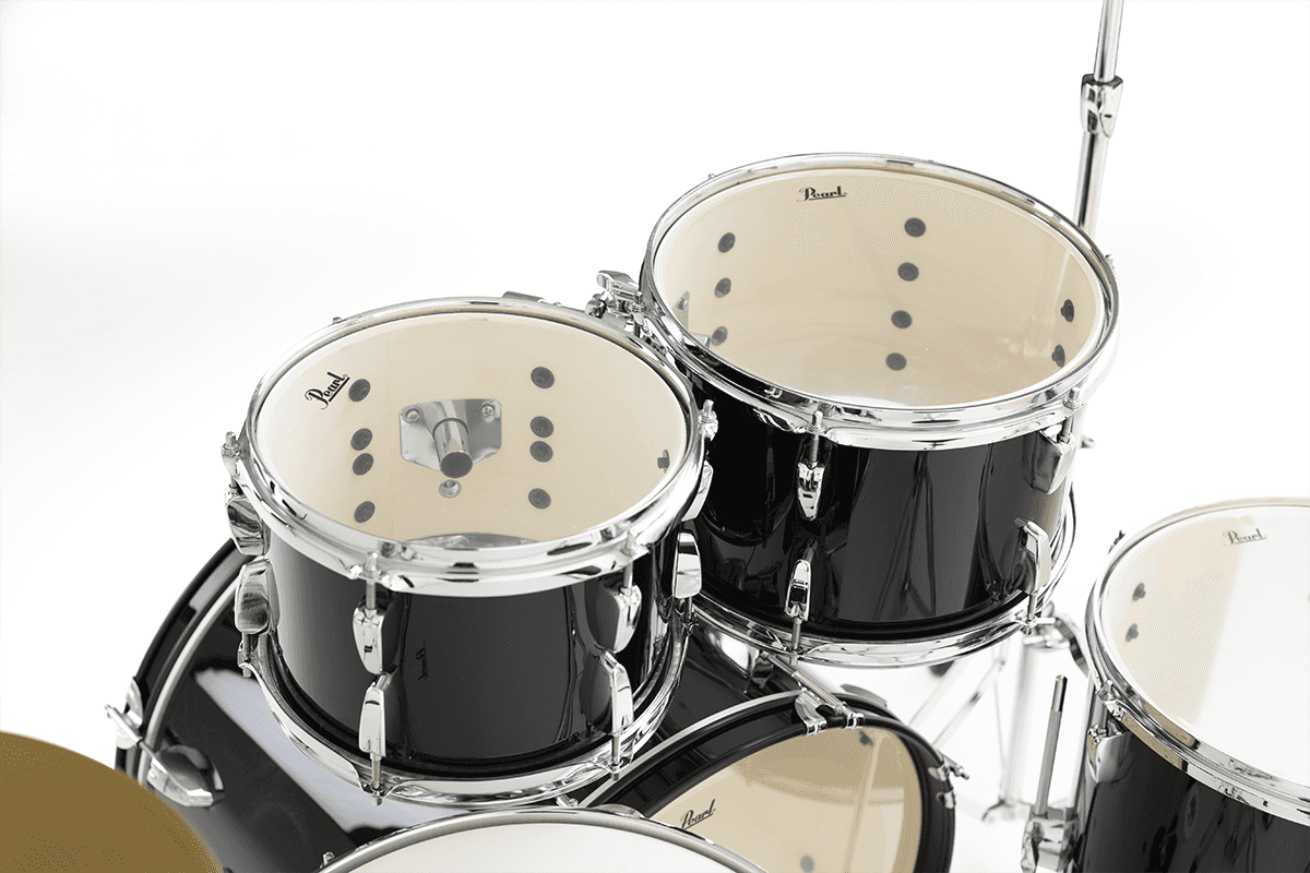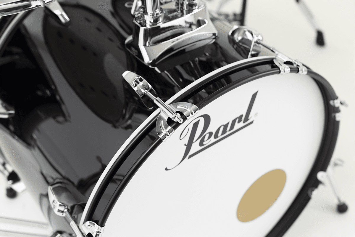 Depuis des années, Pearl fait partie des fabricants qui règnent sur l’entrée de gamme, avec des produits toujours très bien étudiés, de façon à proposer le maximum à un tarif minimum. En attestent ces fûts qui totalisent 6 plis de peuplier pour une épaisseur de 7 mm, avec un Rhodoïd impeccable proposé en trois couleurs. Dans le cas présent, le « Jet black » allie la rareté et l’élégance. Quant à l’accastillage, Pearl affiche comme toujours ses lettres de noblesse, avec une réputation de solidité qui vaut aussi pour ses entrées de gamme. Piques, tiges, coquilles et cercles ne font jamais défaut, tout comme le déclencheur de timbre. Tout a été étudié pour durer, y compris sous les baguettes de débutants qui n’ont pas forcément les bons gestes.