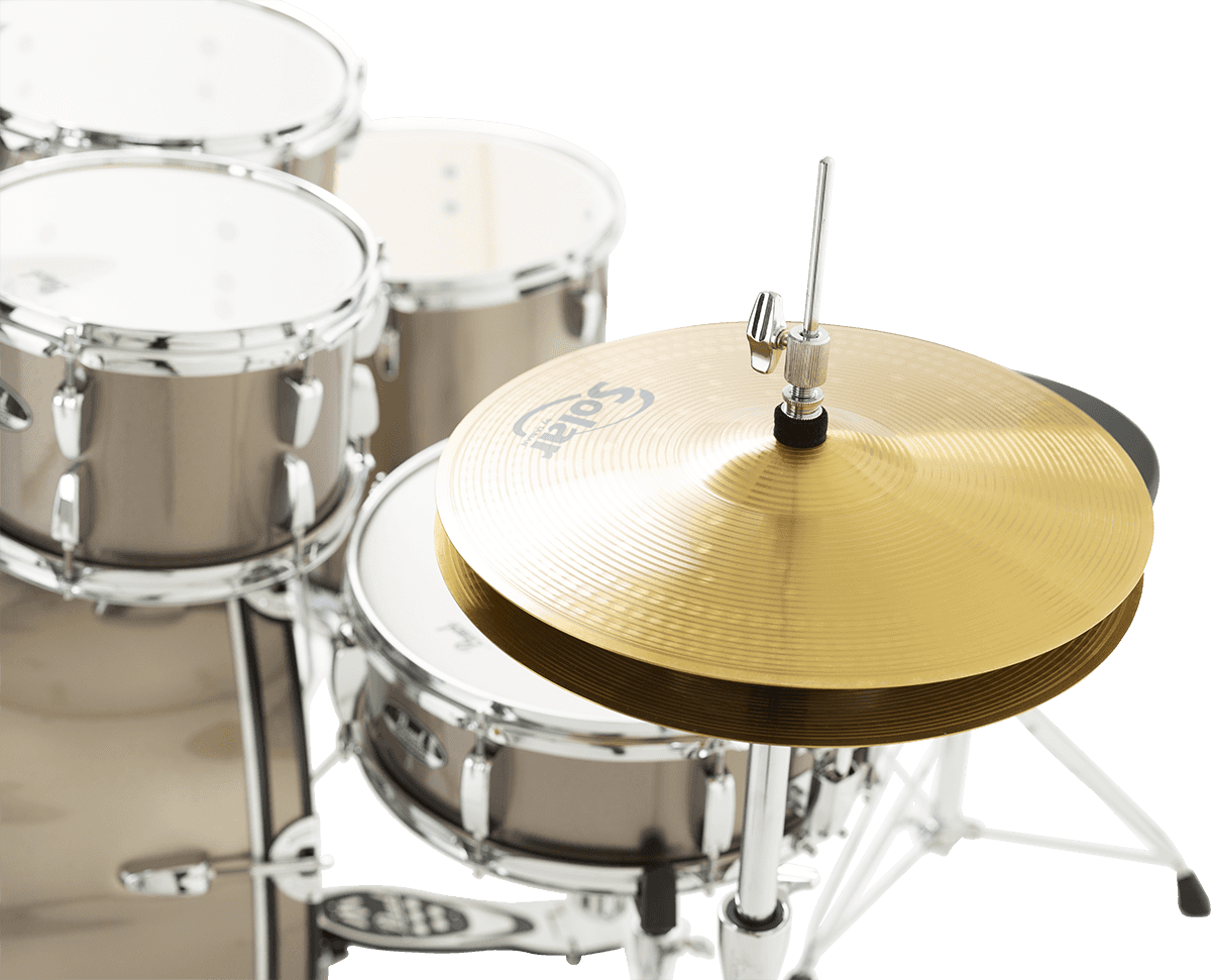 Le côté vraiment sympathique de ce kit, c’est qu’il ne manque rien pour commencer à s’éclater ! Les fûts, les accessoires à double embase (eux aussi considérés comme offrant un très bon rapport qualité/prix sur un marché pourtant concurrentiel), le siège, les cymbales Solar Sabian (des charlestons 14" et une crash/ride 16" qui permettront de prendre ses premiers repères), et même le sac avec les baguettes... Tout est fourni. Alors honnêtement, à ce prix-là, on se dit que les jeunes d’aujourd’hui ont décidément beaucoup de chance !- Accastillage : Chromé