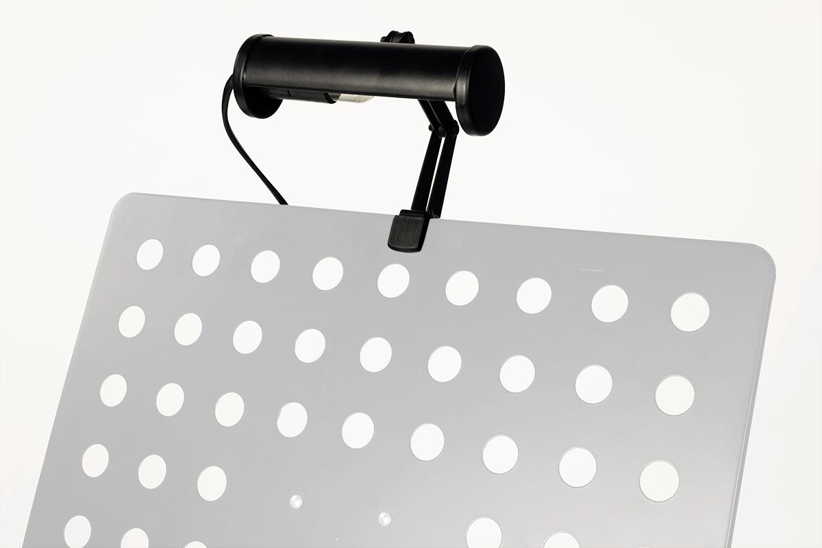 une pince à vissée située à son extrémité permet de l'installer sur de multiples surfaces. C'est le compagnon idéal du pupitre d'orchestre.