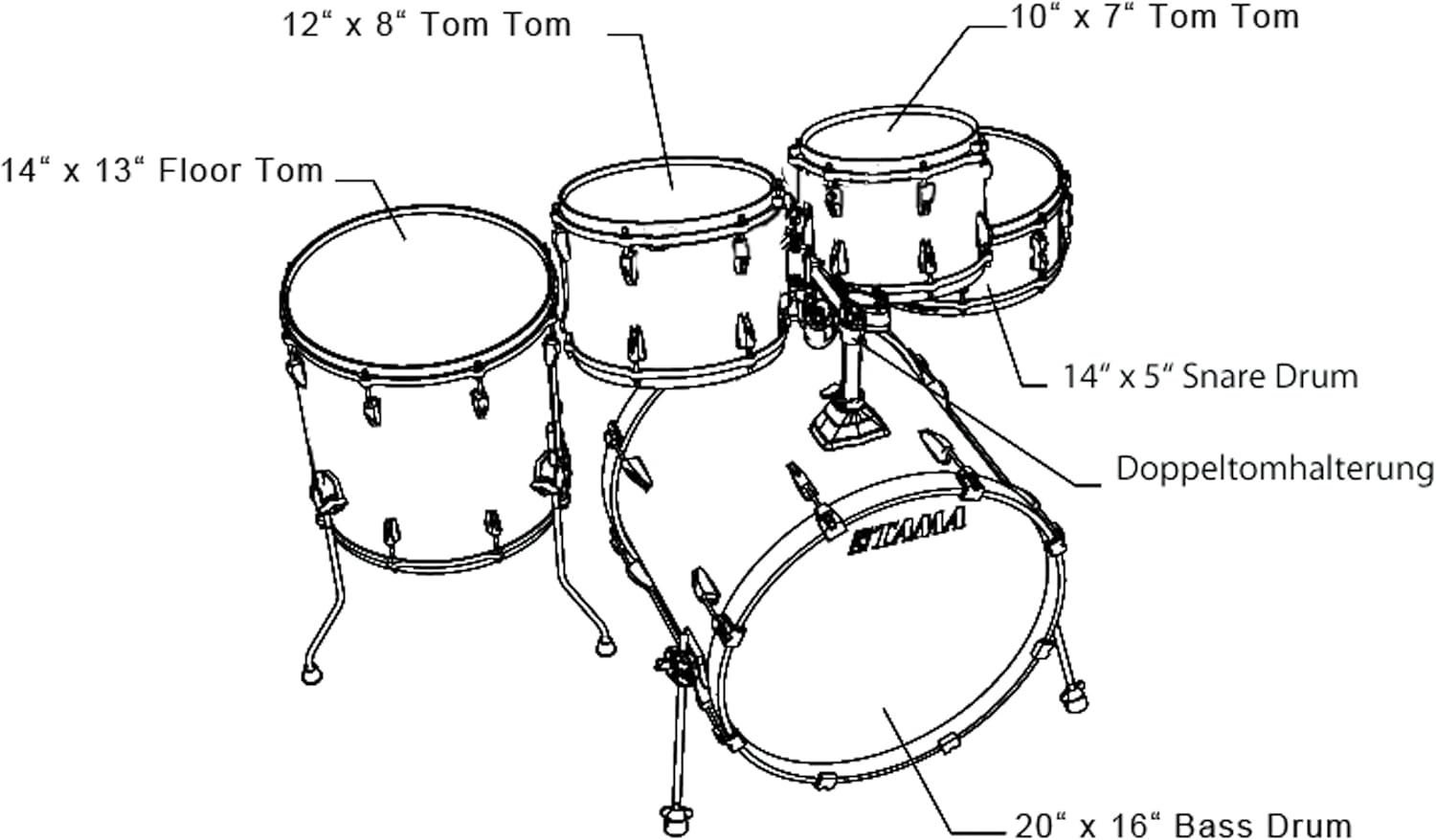 - Drums : Grosse caisse 50,8 x 40 cm, 25,4 x 17,8 + 30,5 x 20,3 cm tom suspendu, 35,5 x 33 cm tom sur pied et 35,5 x 12,7 cm Caisse Claire.