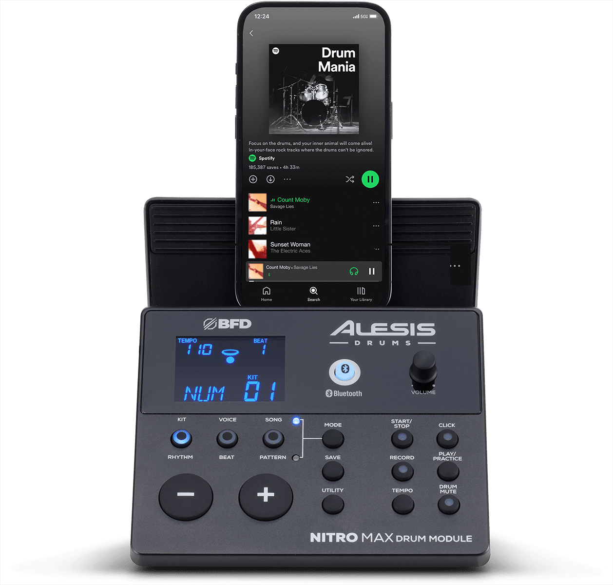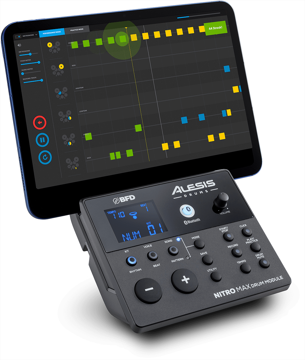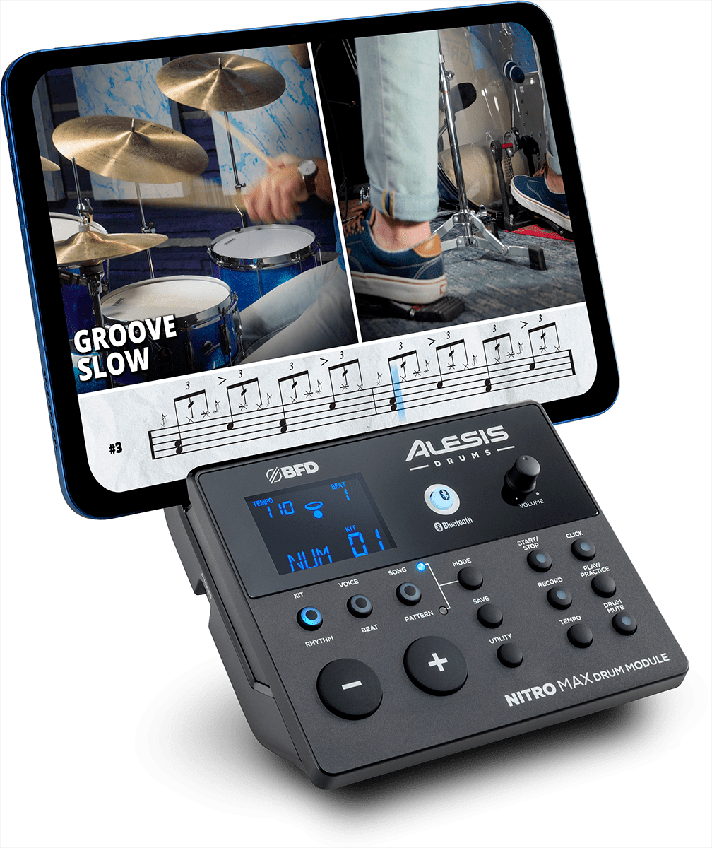 La Nitro Max offre tout ce dont vous avez besoin pour apprendre ou améliorer vos compétences en batterie, et pour devenir bon rapidement. Les peaux maillées premium offrent une expérience de jeu réactive et agréable avec un minimum de bruit externe, vous pouvez donc vous entraîner quand vous le souhaitez. Une large gamme de sons de batterie ultra-réalistes offre une expérience de batterie vraiment immersive, quel que soit votre style de musique. Et une multitude d'outils d'apprentissage différents vous aident à pratiquer et à améliorer votre timing et votre jeu. De plus, vous pouvez jouer en toute fluidité avec vos morceaux préférés de Spotify, Apple Music et d'autres services de streaming via la connectivité Bluetooth.