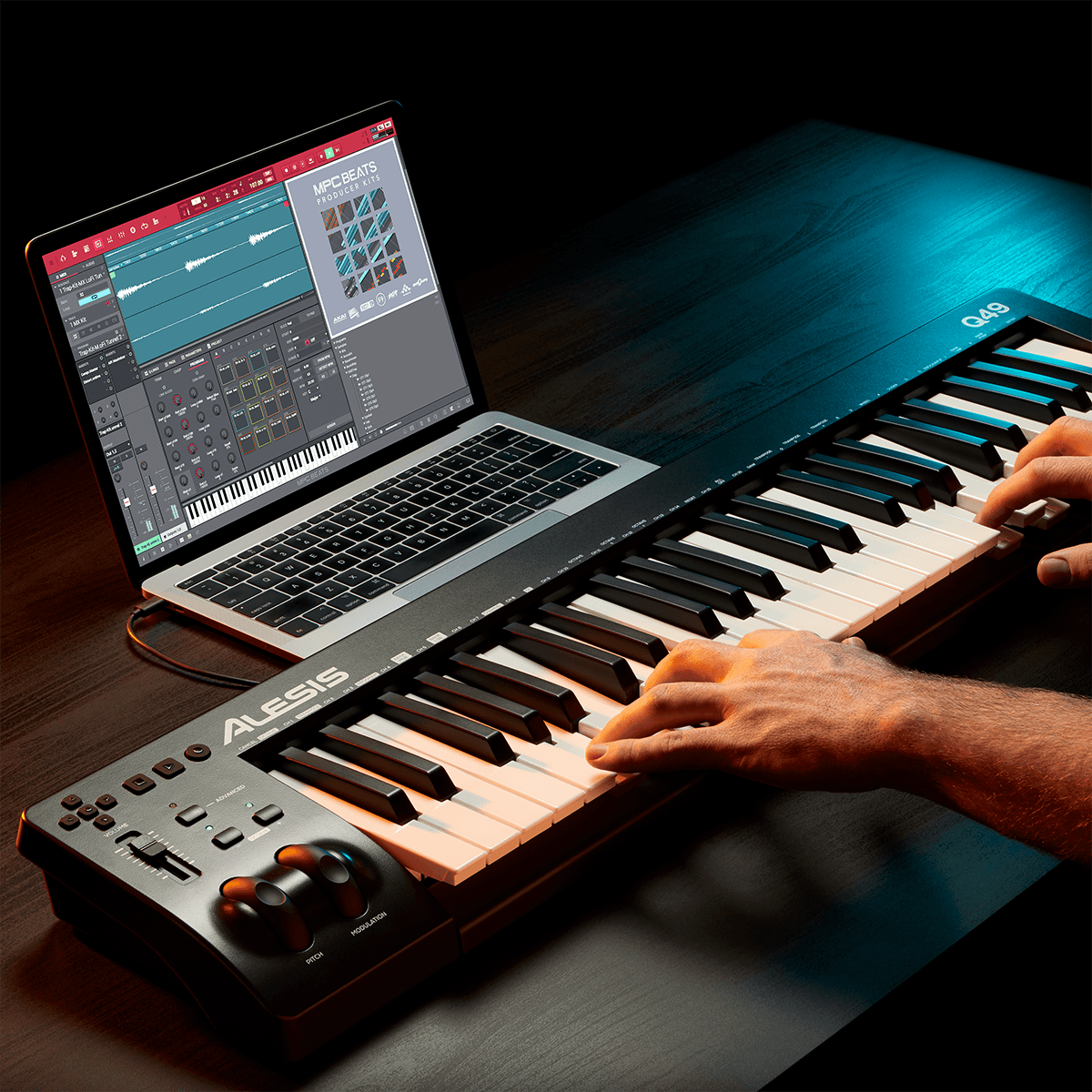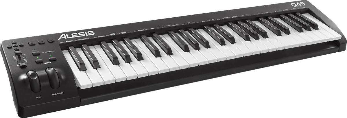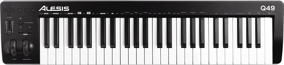 Modèle intermédiaire de la série Q développée par Alesis, le Q49 est l'outil de production idéal aussi bien pour les musiciens mobiles que les producteurs en studio. Ce clavier-maître USB-Midi très bien pensé comprend un clavier de 49 touches toucher léger au format piano, et présente tous les contrôles dont vous avez besoin : une molette de pitch et de modulation ergonomiques, un contrôle aisé du volume (ou de tout autre paramètre) via un fader, une commande d'octave via boutons et une série de boutons directionnels pour piloter les fonctions de votre DAW. Avec ses 2,1 kg sur la balance, il sera aussi à l'aise en studio que sur la route !- Toucher : Semi-lesté