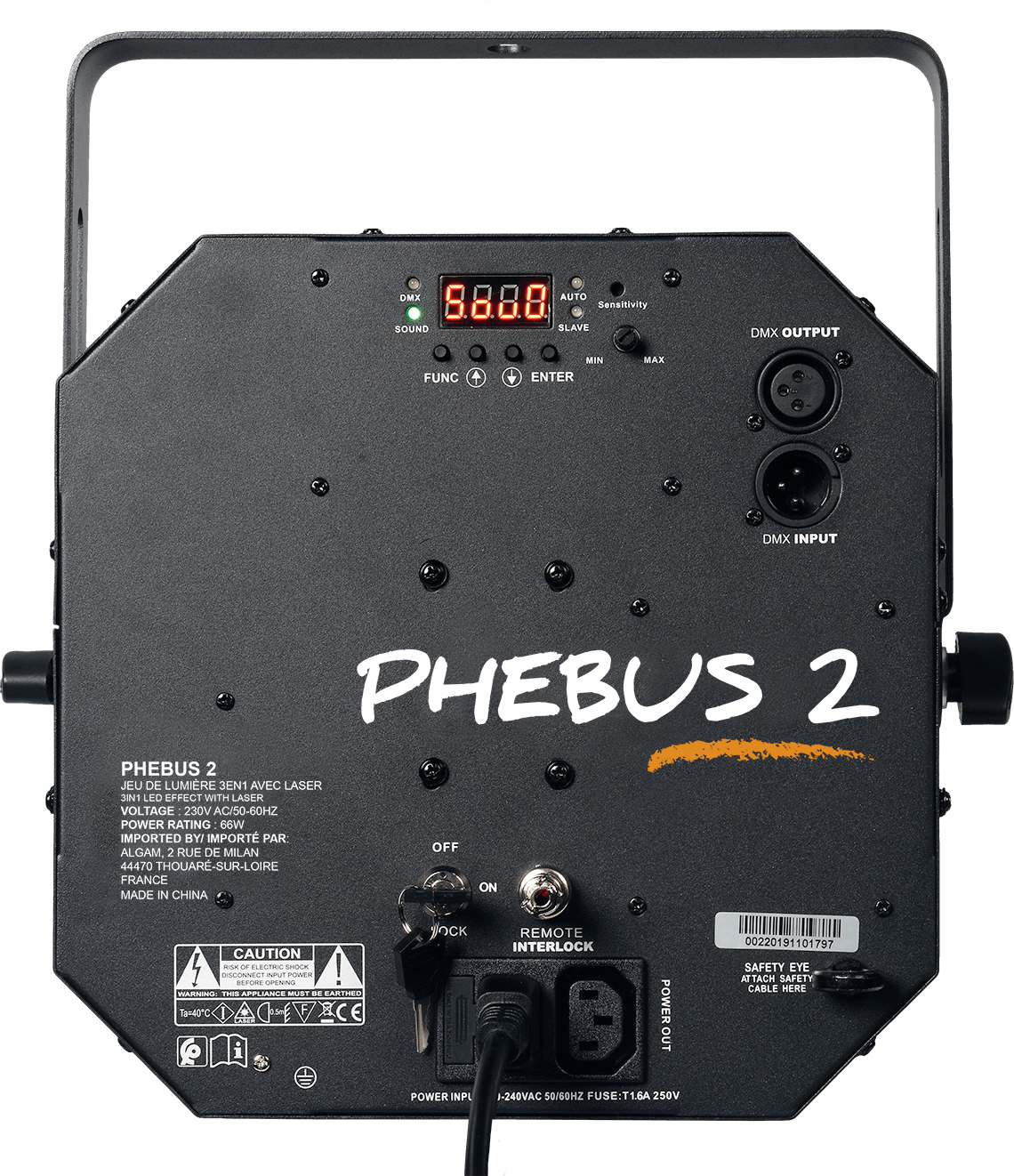 Combo 3-en-1 derby, stroboscope ou wash, laser Derby, Strobe, Laser : tout y est. Sur cette version 2, les 8 LEDs qui assurent l'effet strobe deviennent des 4 en 1 capables de générer aussi bien du blanc que de la couleur. Le Phebus2 est une machine 3 en 1 qui à elle seule permet d’ambiancer une piste de danse des heures durant. Ses nombreux programmes internes assurent des effets rotatifs variés, dans différents modes. Que ce soit par l’intégration du protocole DMX, la présence d’un micro interne pour la reconnaissance de la musique, ou sa robustesse de fabrication, le Phebus2 sera aussi à l’aise dans un cadre privé que pour une utilisation professionnelle.