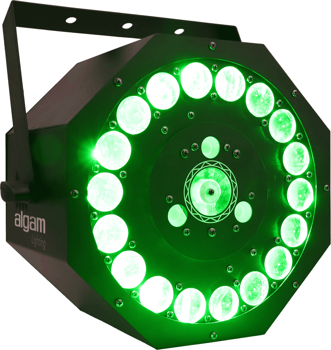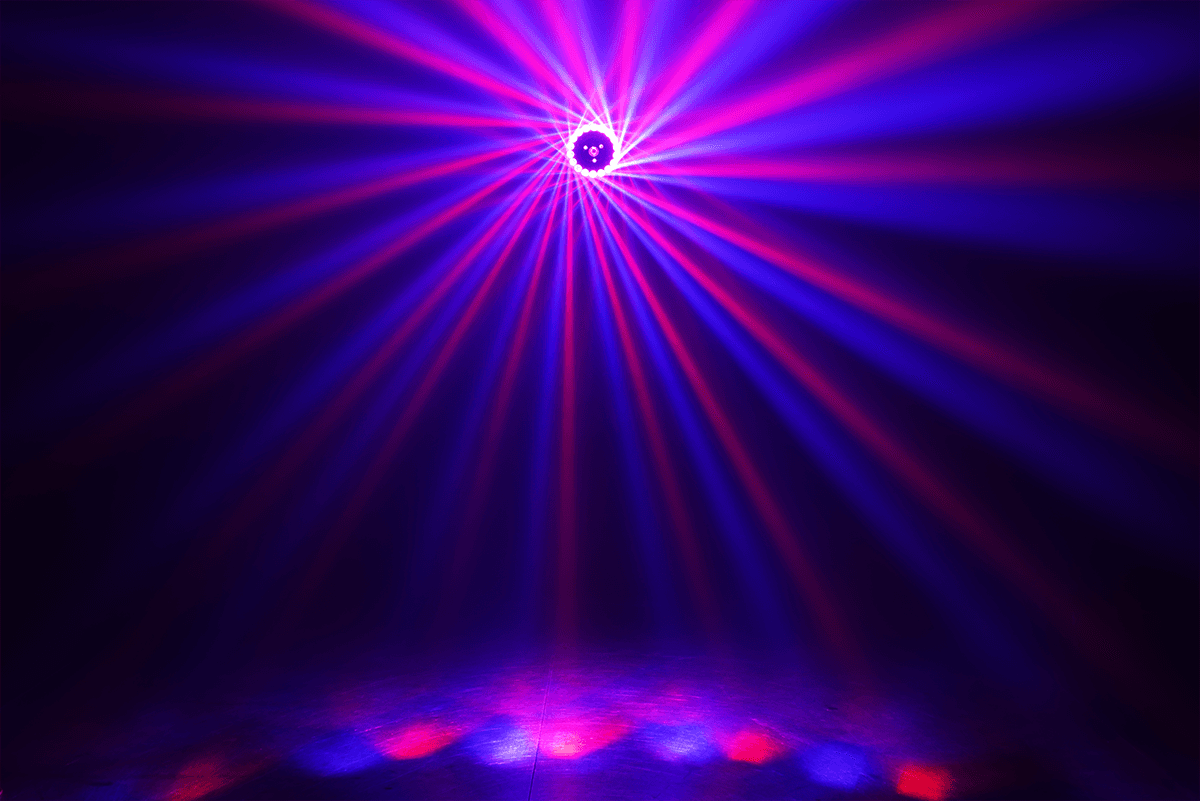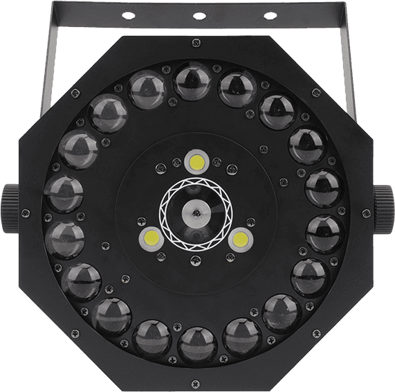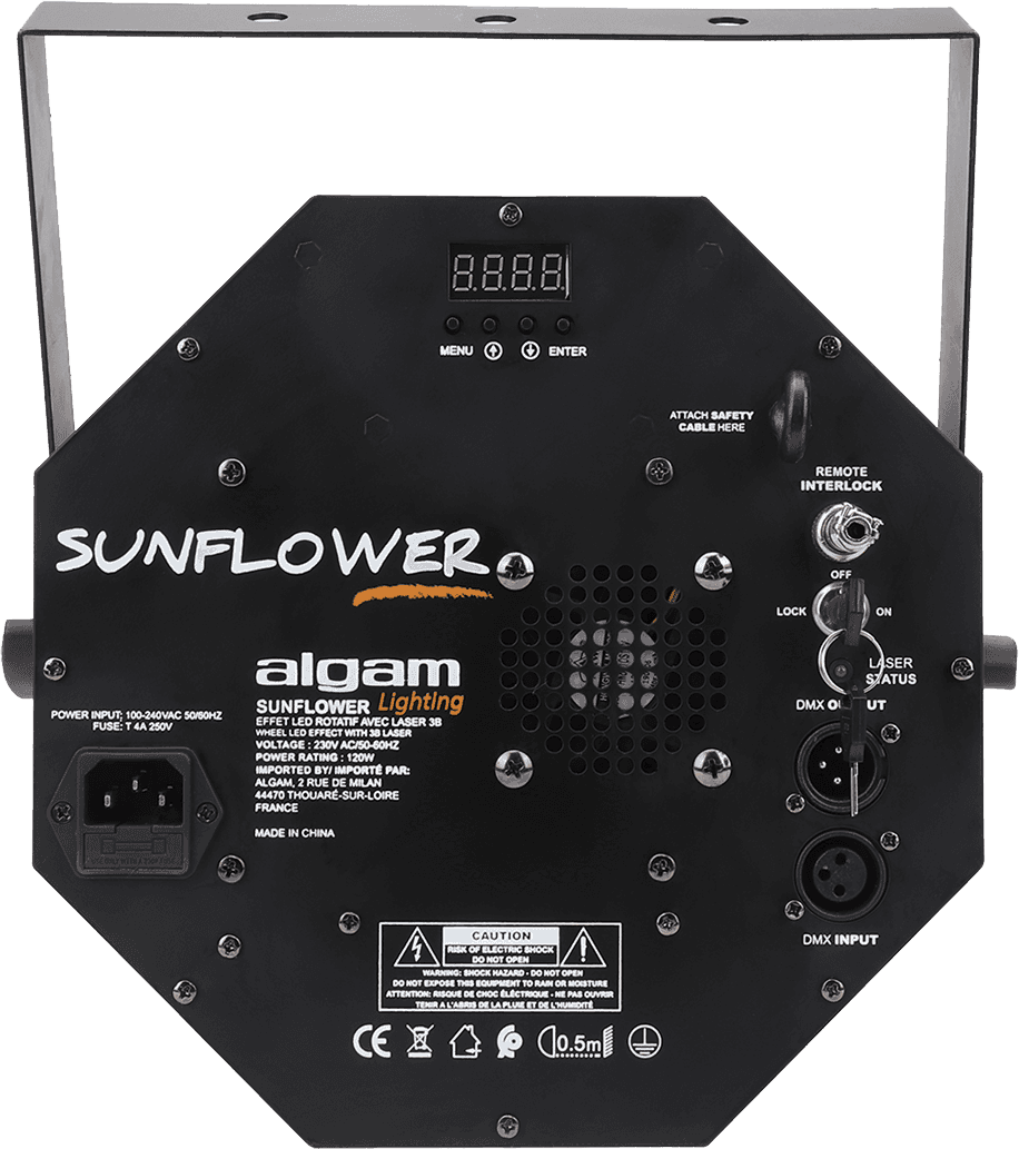 Combo 3-en-1 soleil, stroboscope, laser Le Sunflower, grâce à ses 3 effets complémentaires permet des animations d’une grande diversité. La combinaison de son prisme rotatif à 18 Leds RGB de 3 watts chacune, de son stroboscope de 3 Leds blanches de 20 watts et de son laser vert de 150mW offre des effets de couleurs multiples d’une puissance et d'un dynamisme incroyables pour animer vos soirées. Simple d’utilisation, proposant de nombreux programmes internes pour un fonctionnement automatique ou au rythme de la musique, un mode maître/esclave, le Sunflower est pilotable via DMX.