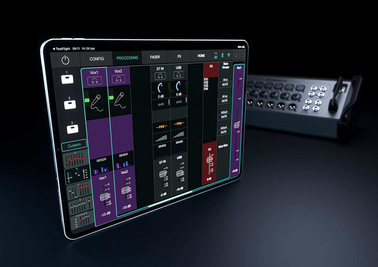 Misant sur un encombrement et un poids réduits au maximum, la CQ-20B présente une interface physique minimaliste et discrète, en faisant la console idéale pour une installation sur scène, en backstage, ou dans une baie près d'une salle de conférence. Cette interface minimaliste est largement compensée par un module WiFi avec antenne dual-band très stable et efficace, permettant d'interagir avec les deux puissantes applications multiplateformes (iOS, Android, MacOS, Windows) dédiées aux CQ : contrôlez tous les paramètres de mixage de votre console comme sur une interface physique classique avec l'application CQ-MixPad, et laissez les artistes contrôler en toute liberté le mix de leur retour personnel avec l'application CQ4You afin de décharger l'ingénieur du son de cette tâche.