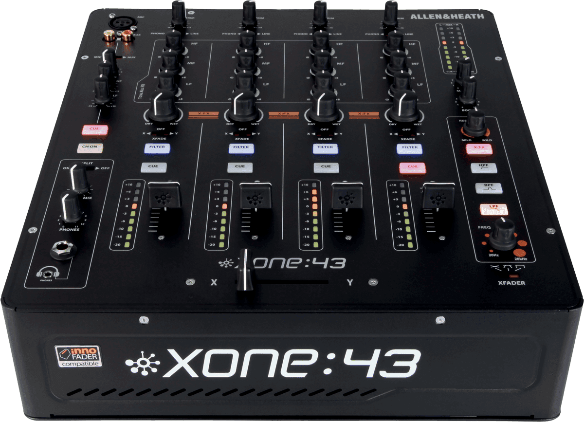 La Xone:43 a spécialement été conçue pour le DJ et les amateurs de musique électronique. Les DJ ayant déjà mixé sur les modèles numériques DB2 et DB4, se sentiront à l'aise avec cette console à 4 voies. Cependant, la Xone:43 est une console analogique, pourvue d'un filtre VCF avec fonction passe-haut, passe-bas et passe-bande, contrôle de résonance et de la fréquence de balayage. Fonctions que l'on retrouve également sur la référence des consoles de mixage, la Xone:92.