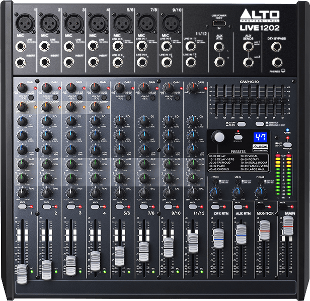 Interface audio USB avec playback indépendant pour faciliter l’enregistrement en prise directe même au cours de vos concerts, compression sur chaque tranche, une avalanche d’effets de qualité puisque signés Alesis, égalisation à 3 bandes, sorties symétrique et asymétrique, entrées avec préamplification et alimentation fantôme idéales pour le branchement des micros, ne sont que quelques-unes des caractéristiques techniques de ces tables de mixage qui non contentes de proposer une fiabilité à toute épreuve présentent des étiquettes de prix ahurissantes. De 8 à 24 canaux, il y a forcément une console Alto Live qui convient à vos besoins et… à vos moyens !
