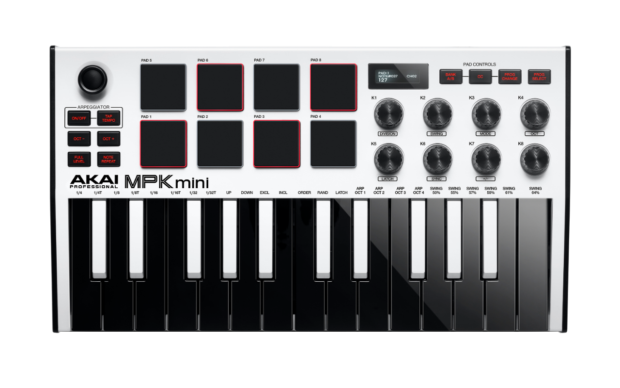 - 8 pads de type MPC avec banques, rétroéclairés, sensibles à la vélocité