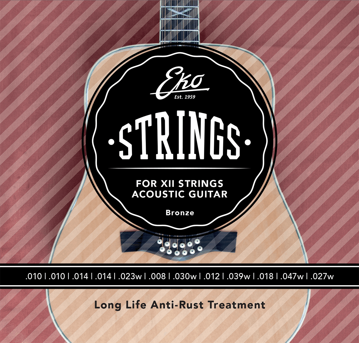Light/12cordes 10/10-14/14-23/08-30/12-39/18-47/27 En plus de proposer ses guitares à l'esprit résolument italien, la marque EKO propose aussi une gamme étendue de jeux de cordes pour guitares acoustiques, électriques, classiques, mais aussi pour basses acoustiques, électriques, ainsi que pour les ukulélés.