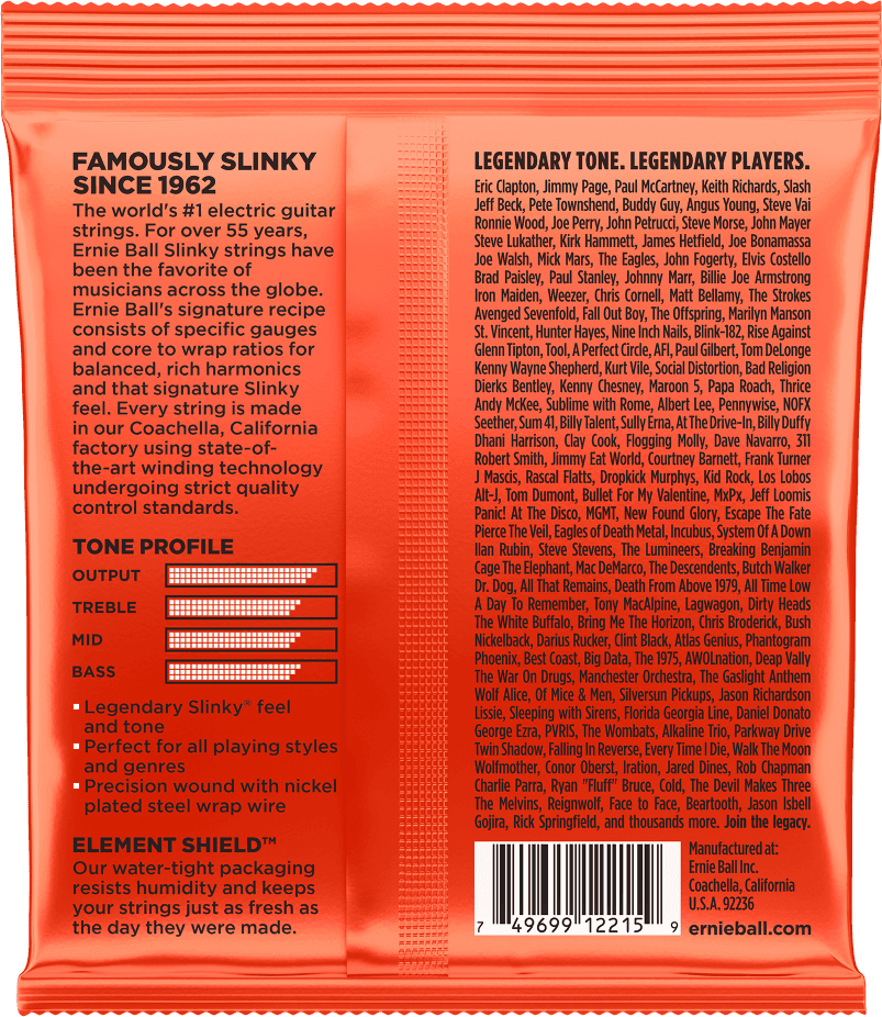 LE jeu de cordes incontournable. Adopté par Eric Clapton, Jimmy Page, Slash, Angus Young et une légion de légendes ! Ces cordes sont fabriquées en respectant un cahier des charges très strict propre à Ernie Ball qui garantit une performance optimale. L'âme hexagonale accueille un fil de nickel pour une durée de vie accrue.