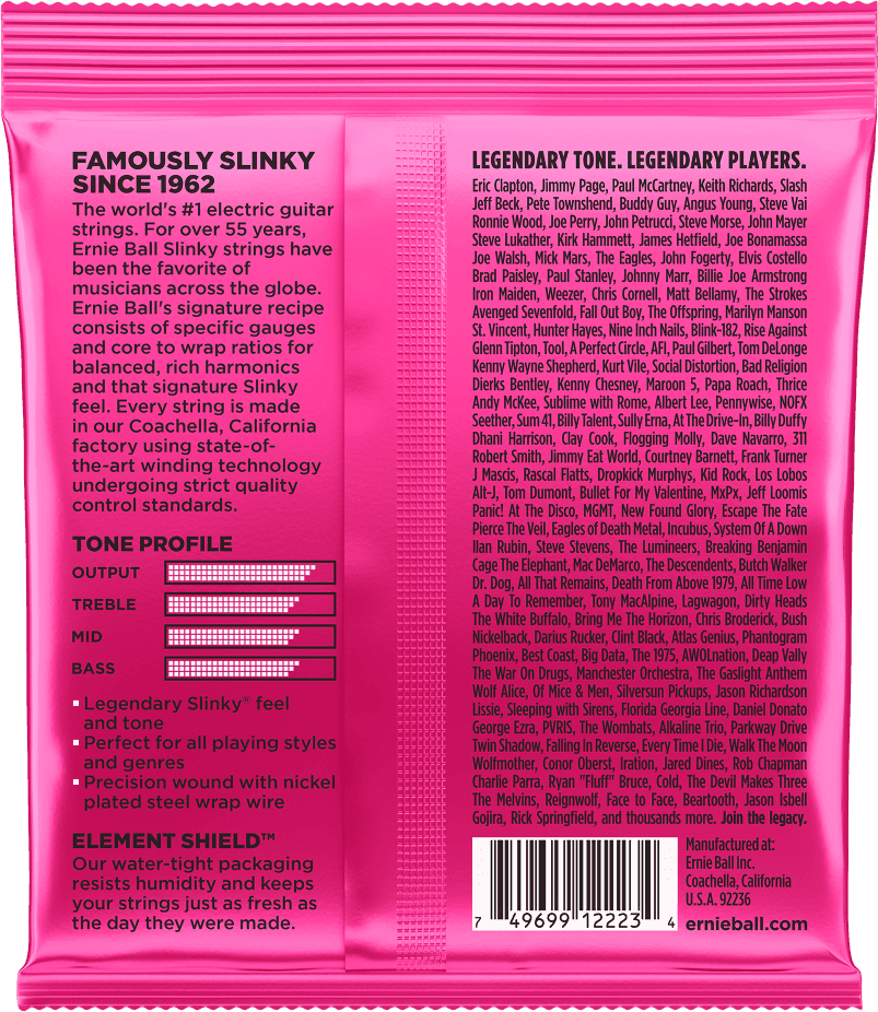LE jeu de cordes incontournable. Adopté par Eric Clapton, Jimmy Page, Slash, Angus Young et une légion de légendes ! Ces cordes sont fabriquées en respectant un cahier des charges très strict propre à Ernie Ball qui garantit une performance optimale. L'âme hexagonale accueille un fil de nickel pour une durée de vie accrue.
