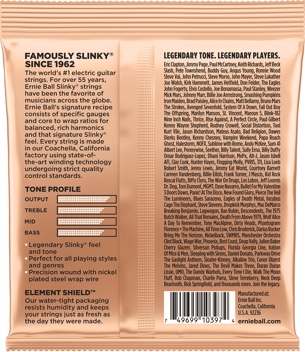 LE jeu de cordes incontournable. Adopté par Eric Clapton, Jimmy Page, Slash, Angus Young et une légion de légendes ! Ces cordes sont fabriquées en respectant un cahier des charges très strict propre à Ernie Ball qui garantit une performance optimale. L'âme hexagonale accueille un fil de nickel pour une durée de vie accrue.