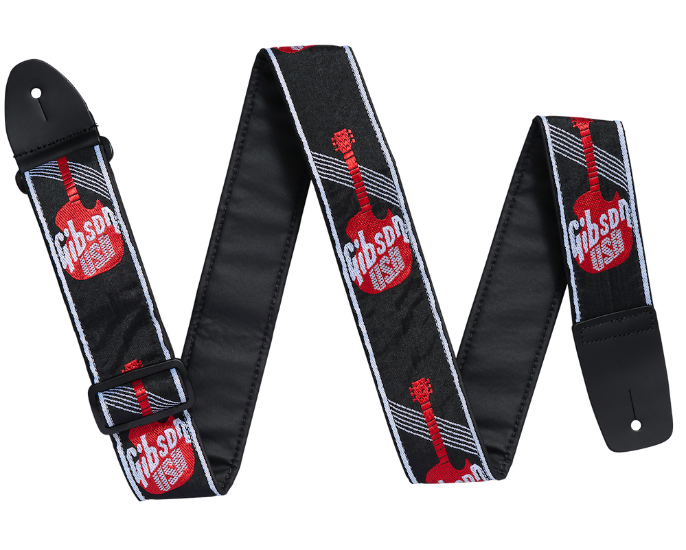 Cette sangle en fibres tissées porte la silhouette de la légendaire Les Paul Standard et d’un patchwork de logos Gibson USA.