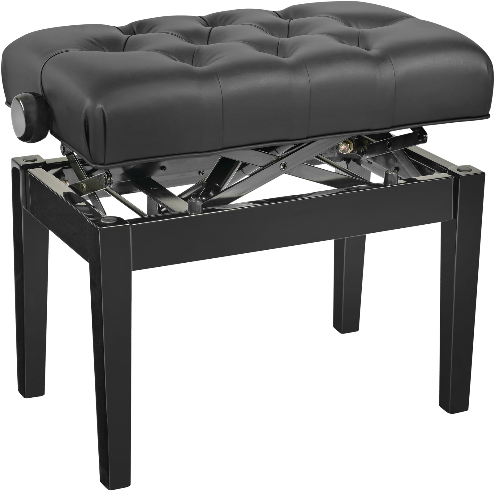 Hydraulique - Banc de piano hydrauliqueCe banc de piano extrêmement confortable est équipé de vérins pneumatiques haute performance. La hauteur réglable en continu de 470 à 570 mm est également idéale pour les écoles de musique. La finition noir brillant et le revêtement en similicuir noir avec clous décoratifs lui confèrent un aspect élégant. Les pieds de nivellement garantissent une stabilité parfaite.