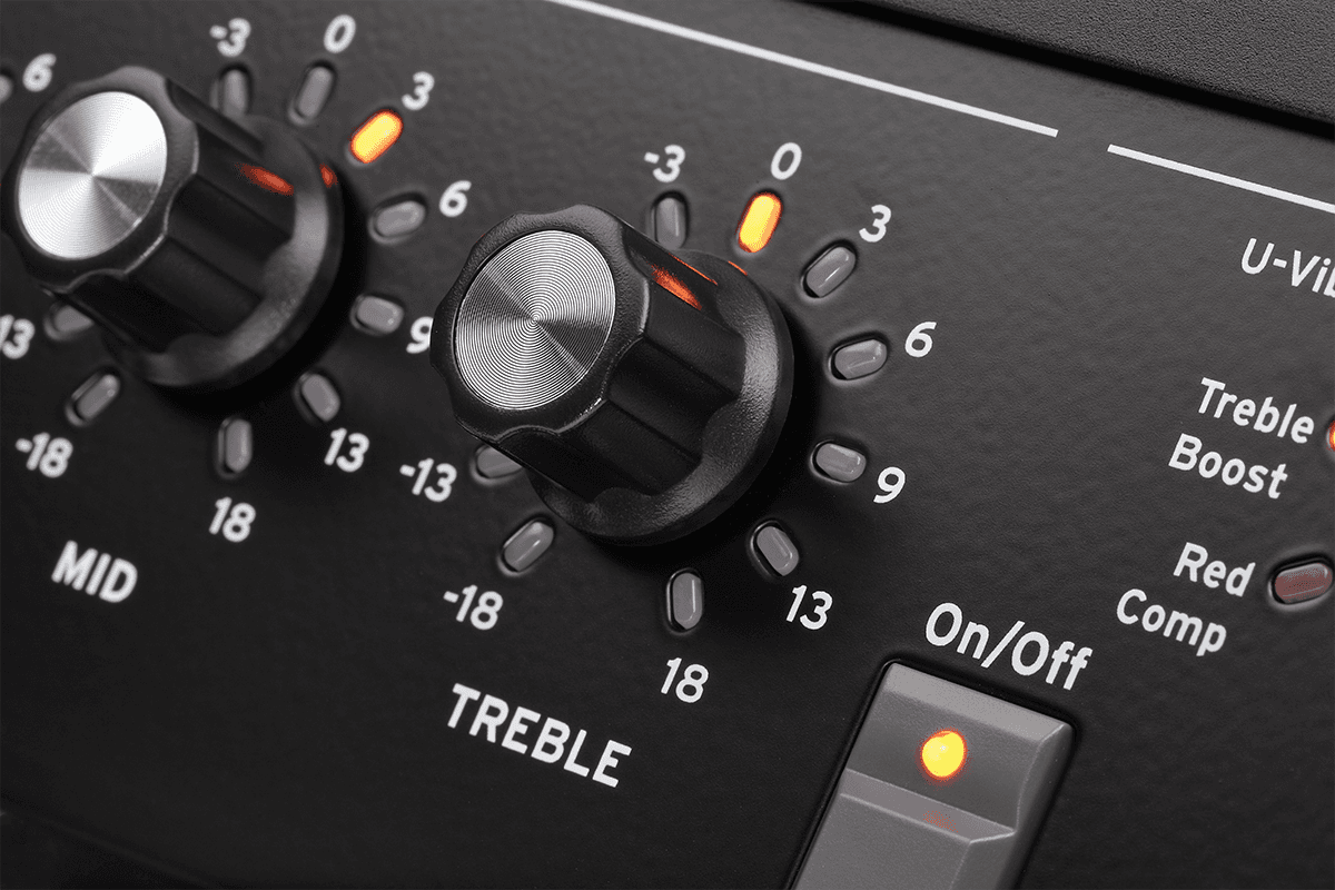 - Egaliseur : Interrupteur On/Off, bouton BASS, bouton MID, bouton TREBLE