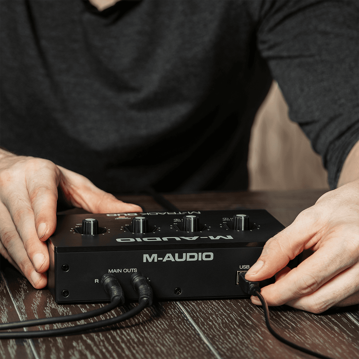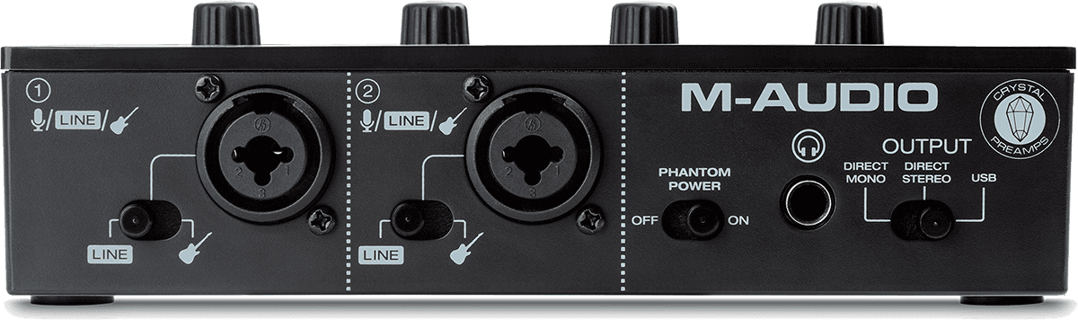 Les entrées combo dont disposent la M-Track Duo présentent l'énorme avantage d'offrir une polyvalence accrue, ne la limitant pas uniquement au branchement d'un seul type d'instrument. Combinant astucieusement une prise XLR et une prise jack, elle vous permet de brancher aussi bien un micro qu'une guitare ou une basse. De plus, le sélecteur de niveau vous permet de commuter les entrées au niveau ligne, afin de pouvoir brancher vos appareils favoris, que ce soit une boite à rythmes ou un piano numérique. Les deux entrées combo intègrent également un alimentation fantôme 48V, pour alimenter vos micros à condensateur.