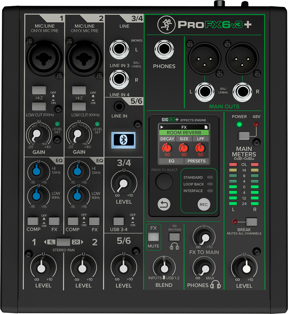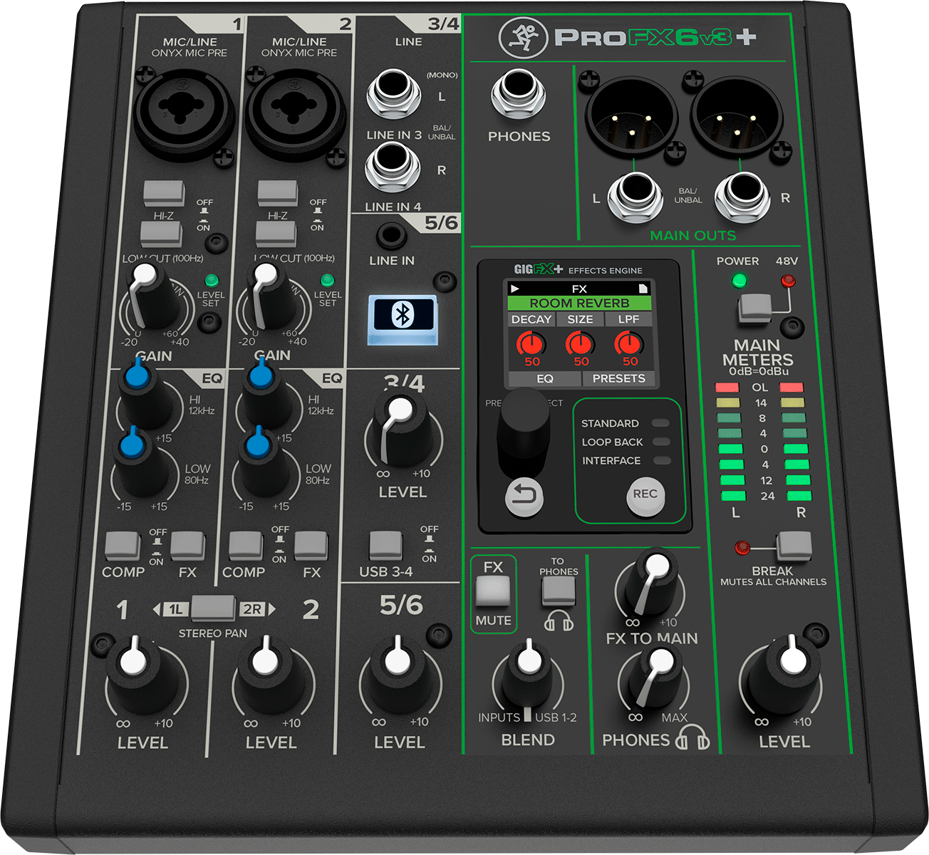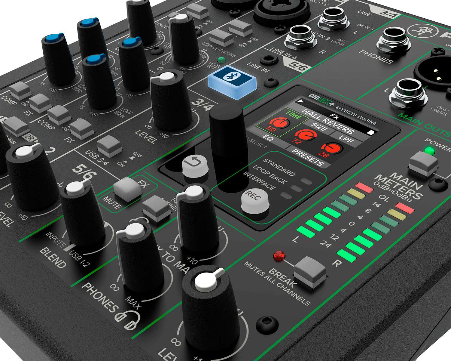 Améliorez votre son à l'aide des effets à haute résolution GigFX+, avec 12 presets que vous pouvez modifier et sauvegarder à la volée grâce au grand écran LCD. Combinant la chaleur d'une console d'enregistrement analogique avec des effets numériques précis, c'est un mixeur idéal pour les home studios et les événements en live.