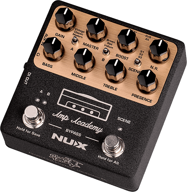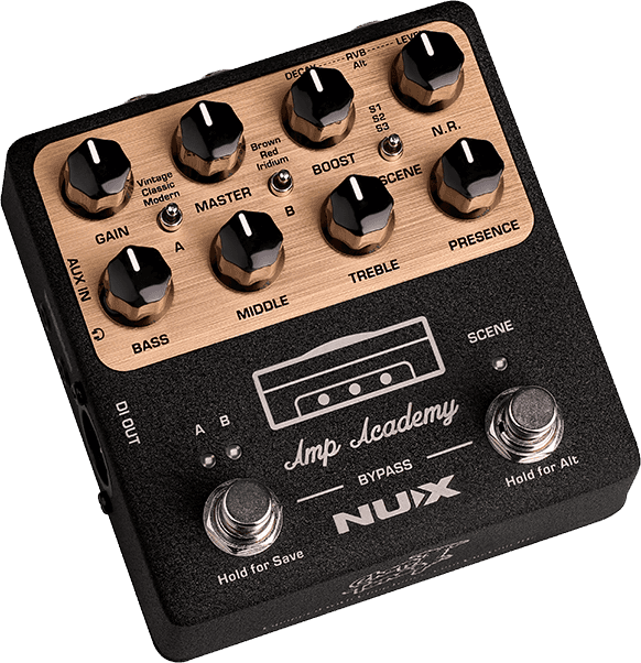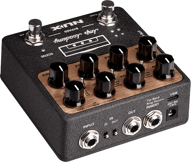 L’AmpAcademy est un modélisateur d’amplis guitare vous permettant de retrouver les sonorités d’amplis de légende, vintage ou moderne, de types « blackface » américain, de combos britanniques ou californiens, ou encore des têtes tout lampes + baffle britannique ou américain de célèbre renommée ! Chaque modélisation d’ampli peut être réglée directement avec les boutons physiques traditionnels de volume, gain et égalisation 4 bandes, mais la pédale propose aussi un réglage de boost et de réduction de bruit pour pousser/maitriser les gains plus élevés. Le footswitch « A/B » sélectionne les amplis clairs (canal A) ou crunchs (canal B). Le footswitch « Scene » fait défiler 3 différentes scènes, activant ou non les différents blocs de signaux d’effets additionnels (NR, EFX, EQ, Fx Loop, Reverb), ce qui permet de gérer l’enchainement de vos sons comme un multi-effet.
