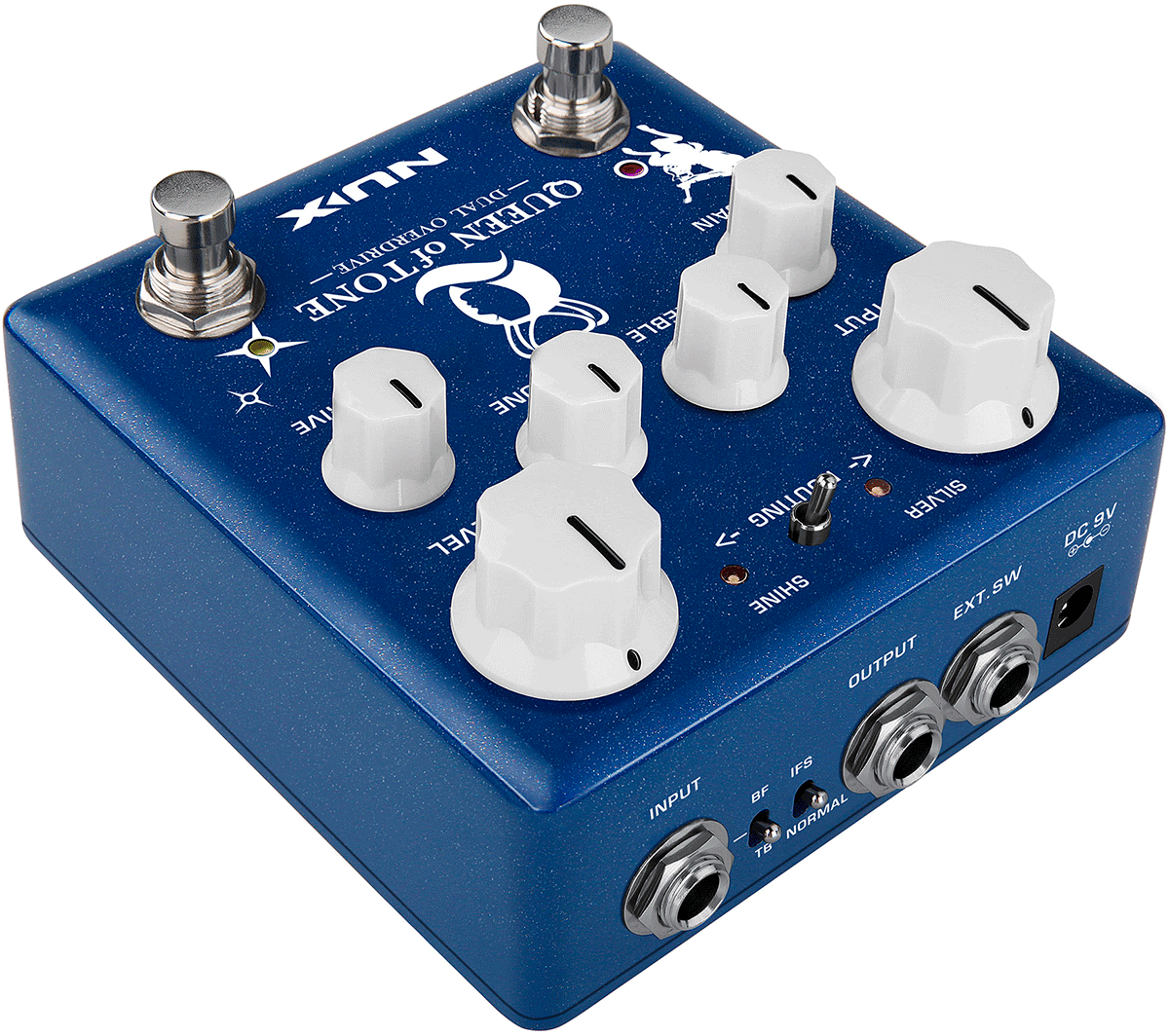 Des fonctionnalités flexibles et inspirantes !La Queen of Tone propose bien plus que les deux pédales MorningStar et Horseman réunies ! Le routage interne conçu permet de choisir l’ordre de votre signal en série : la section MorningStar avant la section Horseman pour un boost en volume/clarté et en fréquences médiums/aigues, ou bien, la section Horseman vers le MorningStar afin de saturer et donner encore plus de caractère au préampli type Breaker. En plus de cette flexibilité du signal des overdrives, la pédale permet de choisir entre un True Bypass ou Buffer bypass afin de préserver votre son suivant votre chainage. Un sélecteur de signal d’entrée IFS (Input FET Stage) permet d’ajouter ou non un étage FET avant les overdrives. Cela boostera de manière harmonique votre ampli à la limite de la rupture/overdrive, parfait pour un rendu final encore plus riche avec les deux overdrives de la pédale ! Enfin, une connexion jack footswitch permet de contrôler l’activation des sections d’overdrive à distance.
