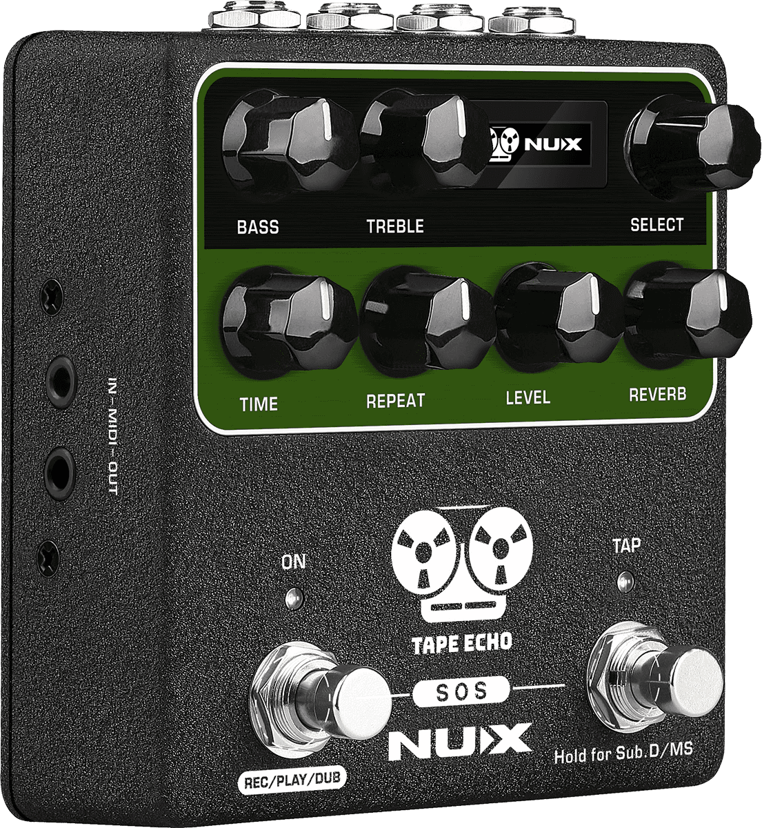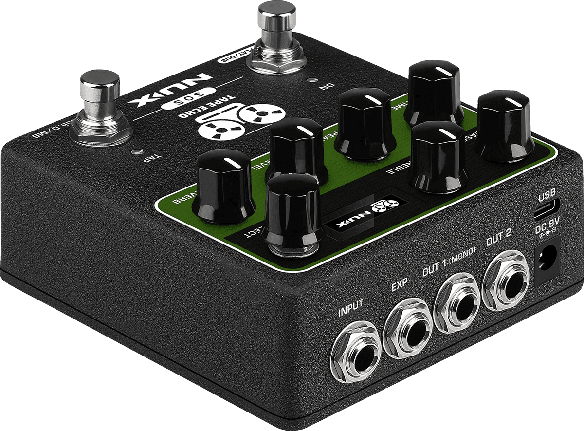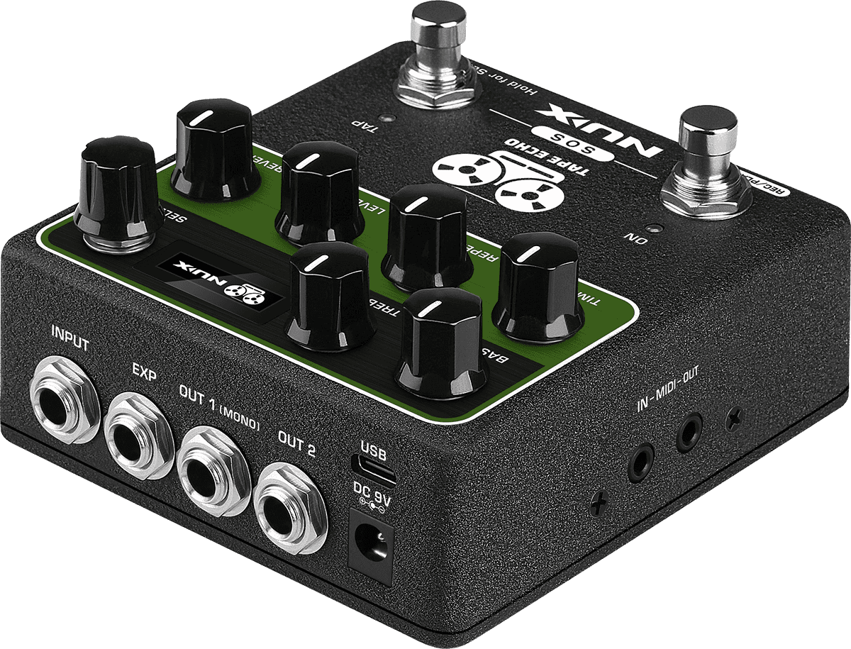 Les deux footswitchs vous permettent encore plus de fonctionnalités. Celui de gauche active ou non l’effet délai dans votre signal, et en restant appuyé dessus l’effet feedback infini prend vie, réinjectant les répétitions du délai à l’infini pour un effet psychédélique apprécié des connaisseurs. Le commutateur de droite gère le tap tempo réglant la longueur du délai avec votre pied. En restant appuyé, ce commutateur permet de gérer les subdivisions ou temps de délai sur l’écran oled. Enfin, en appuyant sur les deux footswitchs en même temps, cela déclenche la fonction SOS (Sound on Sound) qui n’est autre qu’un looper intégré de 40 secondes (rec/play/dub), très pratique pour s’entrainer seul. Une entrée pour pédale d’expression est présente pour pouvoir contrôler le temps, la répétition ou le niveau du délai au pied. Des ports mini-jacks MIDI offre un contrôle de la pédale via ce protocole (des adaptateurs mini-jacks / DIN 5 broches sont inclus avec la pédale) et le MIDI peut être assigné via USB et le logiciel dédiée Tape-Echo. Les deux sorties jack vous permettent l’utilisation en stéréo du délai pour encore plus d’ampleur à votre son !