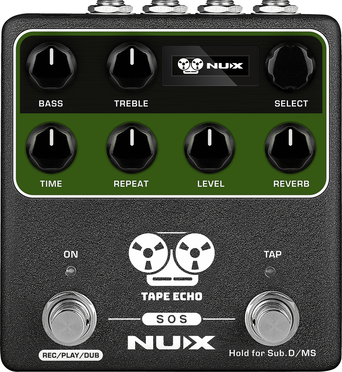 Des fonctionnalités complètes et évoluées, un logiciel dédié pour les affiner !Le Nux Tape Echo modélise les 3 têtes de reproduction/lecture et permet de mêler les différentes têtes pour offrir 7 combinaisons possibles de délais, sélectionnables via le réglage « select ». Un dernier mode avec seulement la Reverb qualité studio embarquée est aussi prévu. Sept combinaisons de signatures rythmiques sont également disponibles pour enrichir vos variations de délais. Les boutons de contrôle de time, level et repeat permettent de régler à votre guise le temps du délai, son mixe dans le signal, et le nombre de répétitions du délai, pour des slapback unique et rapide jusqu’à des délais longs et infinis, utilisés dans les musiques psychédéliques ! Une égalisation 2 bandes (bass et treble) permet d’ajuster les fréquences de vos délais, mais n’affectera pas votre reverb.