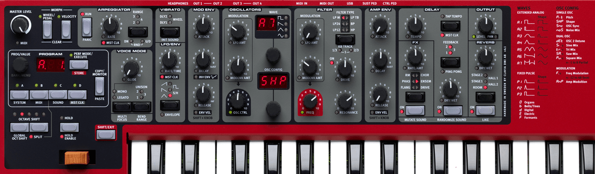 Le Nord Lead A1 reprend également certains des ingrédients qui ont fait le succès des synthés Nord comme le morphing via la vélocité et la molette de modulation, ajoutant ainsi un contrôle des paramètres en temps réel exceptionnel. Vous disposez également d'un arpégiateur indépendant par partie, d'une horloge maître permettant de synchroniser le Lfo, le délai et l'arpegiateur, du contrôle des informations Midi via le port USB intégré et de quatre sorties indépendantes. Le Nord Lead A1 est également compatible avec le Nord sound manager permettant ainsi la sauvegarde des sons et une gestion simplifiée des mémoires utilisateurs.