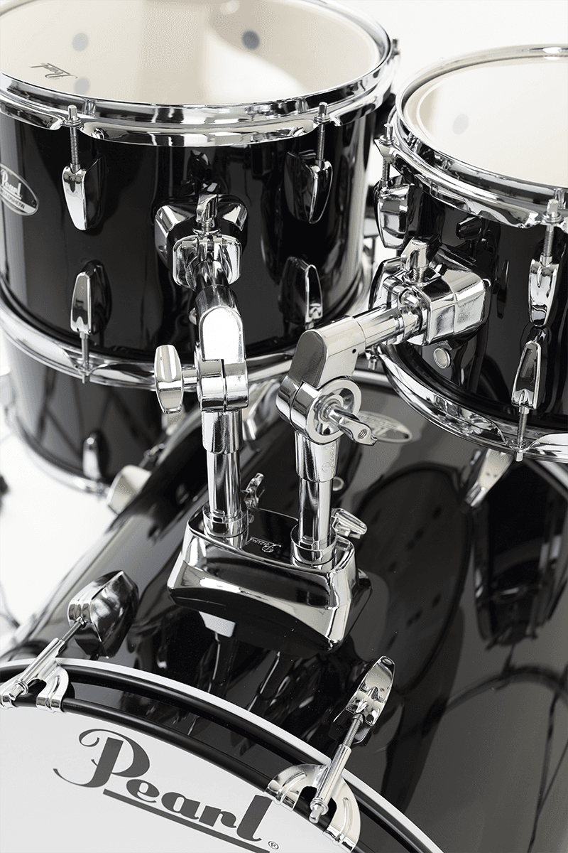 Depuis des années, Pearl fait partie des fabricants qui règnent sur l’entrée de gamme, avec des produits toujours très bien étudiés, de façon à proposer le maximum à un tarif minimum. En attestent ces fûts qui totalisent 6 plis de peuplier pour une épaisseur de 7 mm, avec un Rhodoïd impeccable proposé en trois couleurs. Dans le cas présent, le « Jet black » allie la rareté et l’élégance. Quant à l’accastillage, Pearl affiche comme toujours ses lettres de noblesse, avec une réputation de solidité qui vaut aussi pour ses entrées de gamme. Piques, tiges, coquilles et cercles ne font jamais défaut, tout comme le déclencheur de timbre. Tout a été étudié pour durer, y compris sous les baguettes de débutants qui n’ont pas forcément les bons gestes.