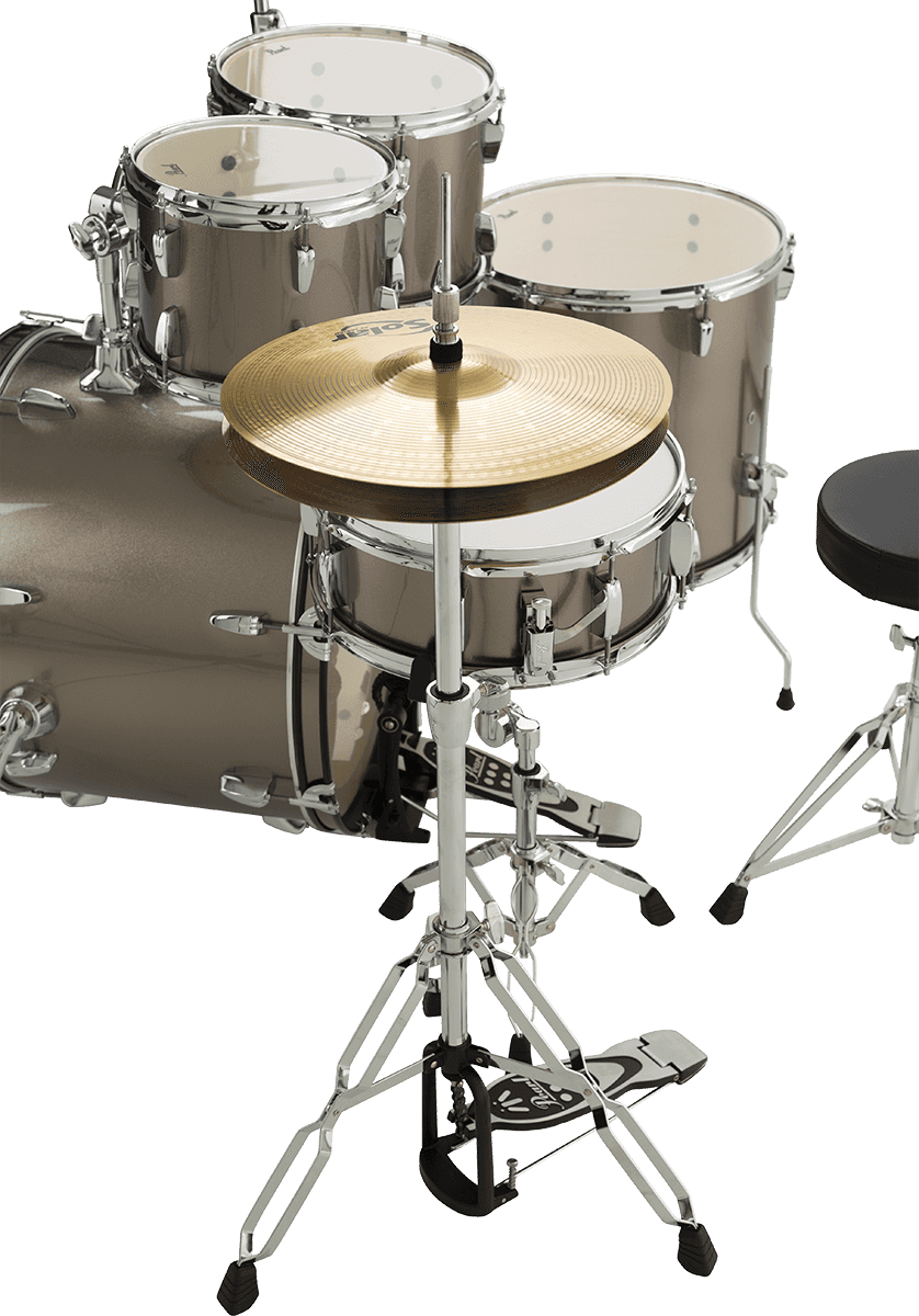 Le côté vraiment sympathique de ce kit, c’est qu’il ne manque rien pour commencer à s’éclater ! Les fûts, les accessoires à double embase (eux aussi considérés comme offrant un très bon rapport qualité/prix sur un marché pourtant concurrentiel), le siège, les cymbales Solar Sabian (des charlestons 14" et une crash/ride 16" qui permettront de prendre ses premiers repères), et même le sac avec les baguettes... Tout est fourni. Alors honnêtement, à ce prix-là, on se dit que les jeunes d’aujourd’hui ont décidément beaucoup de chance !- Accastillage : Chromé